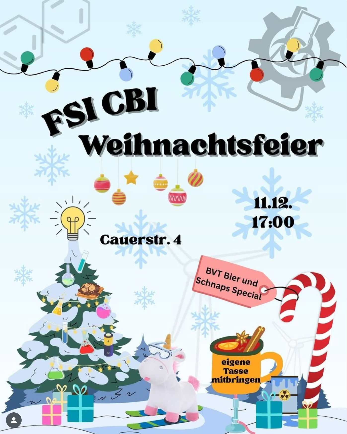 FSI CBI Weihnachtsfeier Datum: 11. Dezember 2025Zeit: 17:00 – 23:30Ort: Cauerstr. 4, 91058 ErlangenBild: FSI CBI Zum Kalender hinzufügen DetailsDatum:11. Dezember 2025Zeit:17:00 – 23:30Ort:Cauerstr. 4, 91058 Erlangen Veranstaltungskategorien:CBI Termine